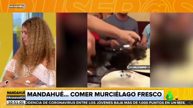 En las imágenes se muestra a varios jóvenes pasándose de mano en mano un murciélago extraído de una sopa. Un vídeo al que Angie Cárdenas ha reaccionado de manera muy divertida. "Ahora me diréis que sabe a pollo", ha exclamado sin mirar evitando mirar, ante las risas de sus compañeros.