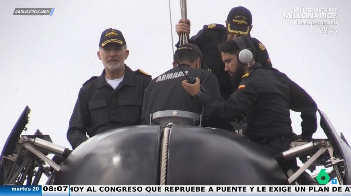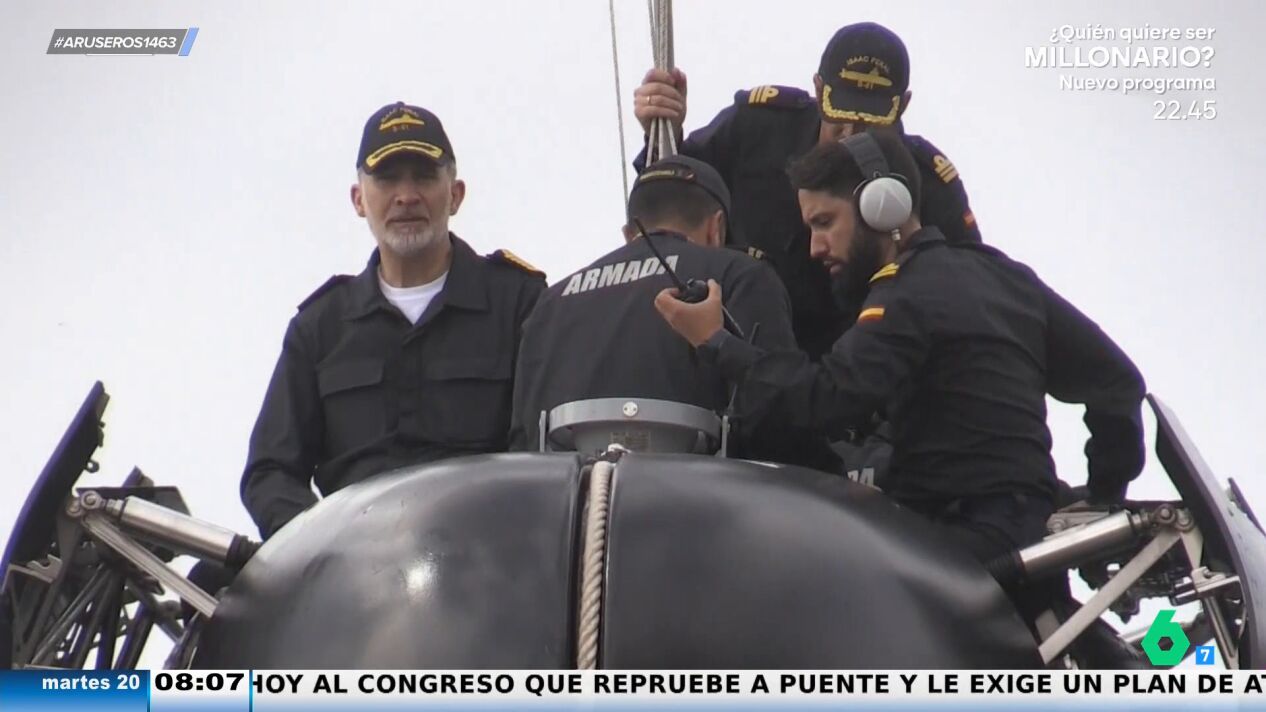 El rey Felipe se ha convertido en tripulante de un submarino, que amadrinó hace cuatro años Leonor. El monarca ha viajado hasta Murcia para embarcarse en este submarino de la Armada. "Yo el submarino lo veo claustrofóbico", afirma Alfonso Arús en el plató, donde Patricia Benítez resalta el uniforme que lleva el rey en esta ocasión: "No tenía yo controlado este uniforme, eh".