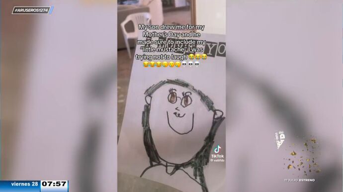 Un niño dibuja a su mamá pero la pinta con bigote. La progenitora se emociona al ver el regalo de su hijo con el mensaje 'I love you'. La mujer se fija un poco más en el retrato, ve que tiene una raya negra debajo de la nariz y le pregunta su peque qué es eso. El niño le responde que es un bigote.