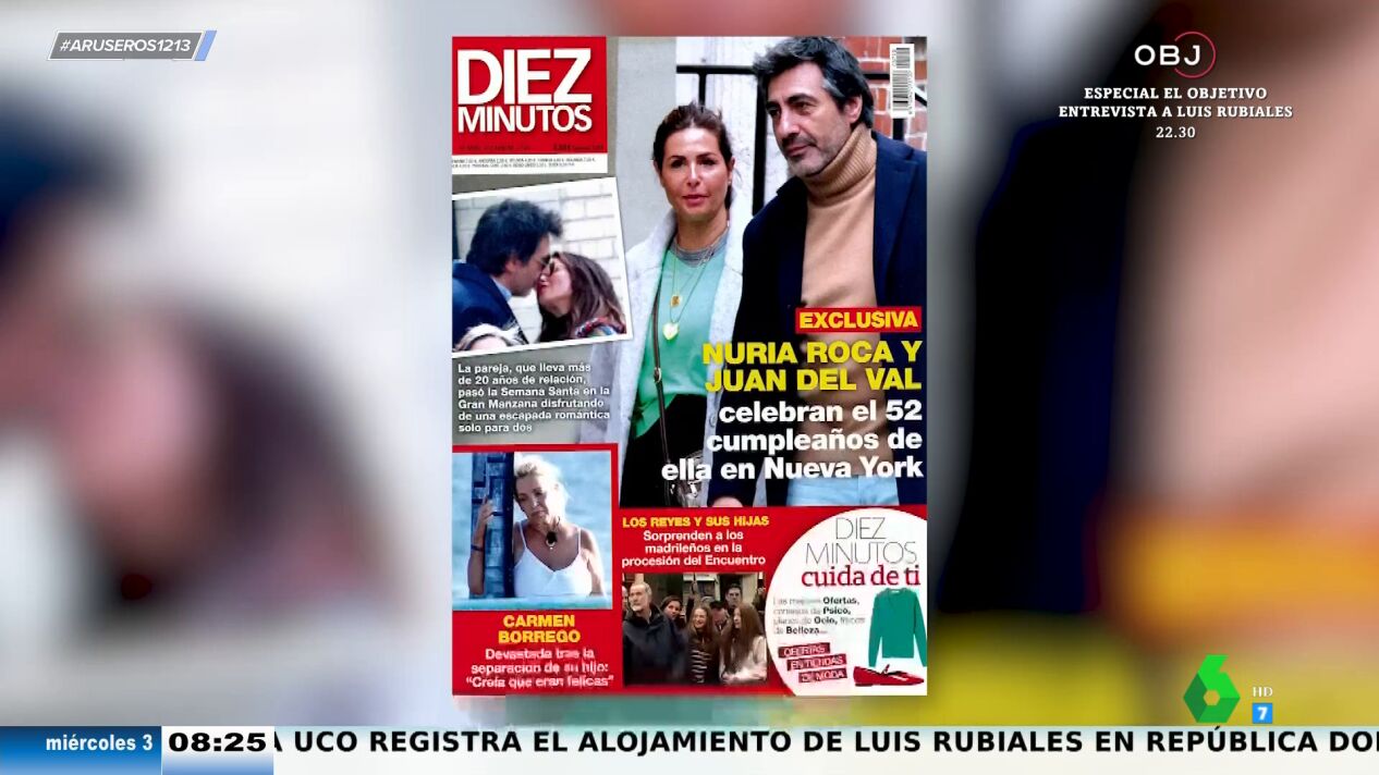 Alfonso Arús y Tatiana Arús repasan las portadas de las revistas del corazón. Por ejemplo, la de '10 minutos' la protagonizan dos presentadores de laSexta. Se trata de Nuria Roca y Juan del Val, que han aprovechado el parón de La Roca por Semana Santa para viajar hasta Nueva York.