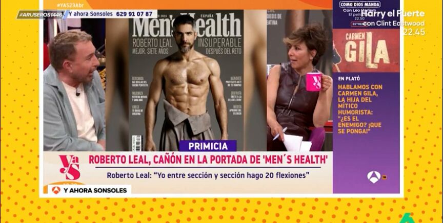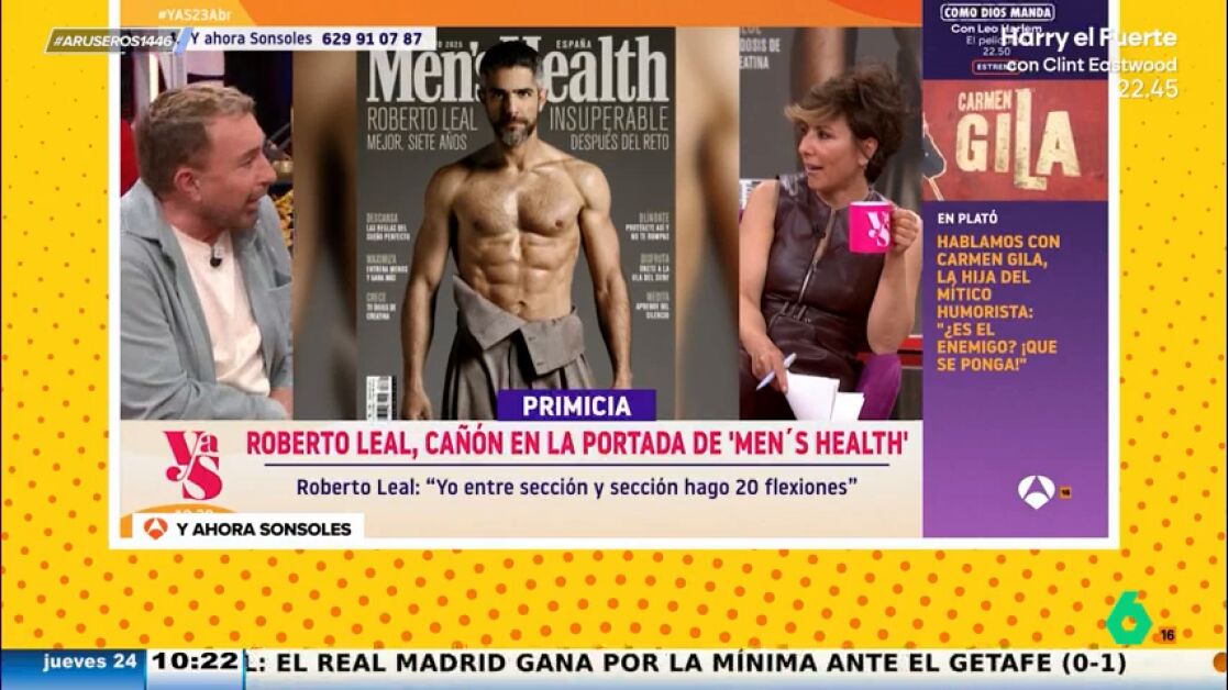 "No digo nada, ¿eh?", comenta Sonsoles Ónega tras ver la nueva portada de la revista Men's Health y descubrir los esculpidos abdominales deRoberto Leal, fotografiado sin camiseta. Sin embargo, tampoco hace falta que pronuncie una sola palabra, porque con su mirada ya puede saberse perfectamente lo que está pasando por su mente, como podemos ver en este fragmento del programa Y ahora Sonsoles del que se hace eco Aruser@s.