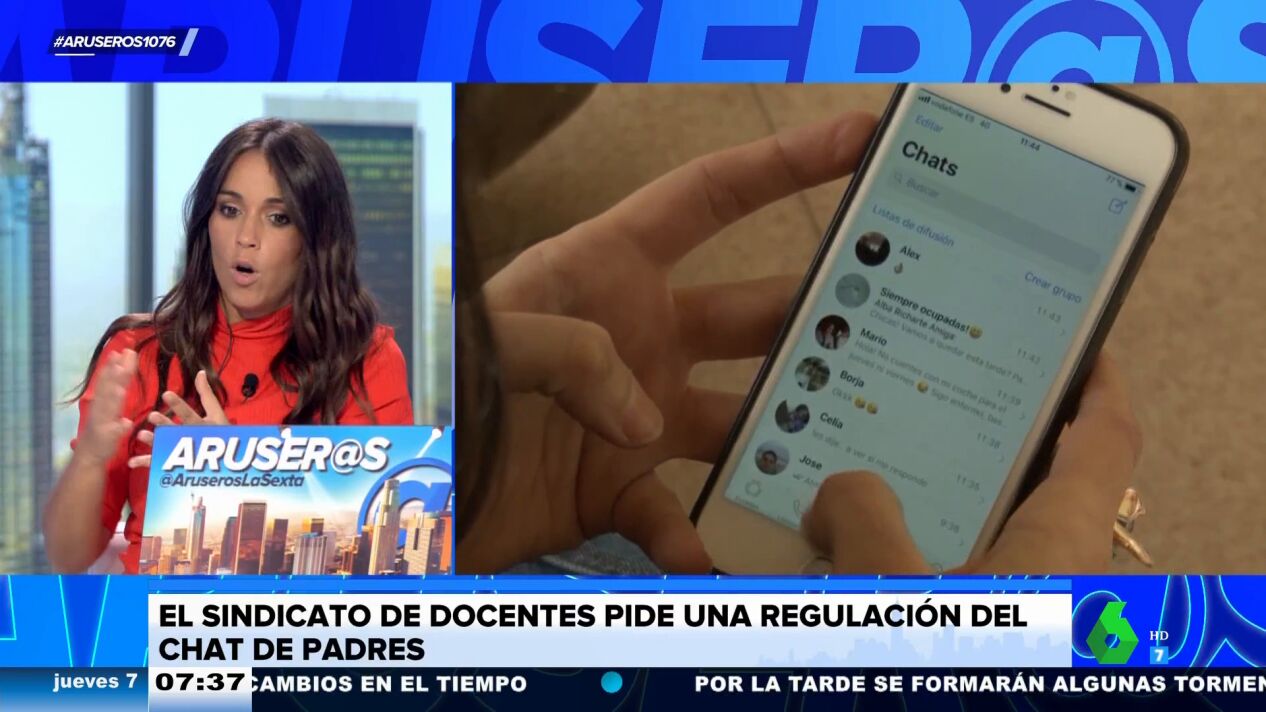 Alba Sánchez informa en el plató de Aruser@s que los Sindicatos de profesoras han pedido al Gobierno que haya una regulación de los grupos de Whatsapp de padres, ya que aseguran que son foco de conflictos. Critican que se traten asuntos privados y a horas intempestivas en los grupos.