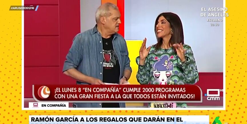 'En compañía' de Castilla La Mancha Media cumple esta tarde 2.000 programas y lo van a festejar a lo grande. Alfonso Arús y los tertulianos no han perdido la ocasión de darle la enhorabuena al presentador vasco, que es un mítico zasquero. "Felicidades a Ramón García y a todo su magnífico equipo", ha dicho Alfonso Arús entre los aplausos de los tertulianos antes de pasar al zasca.