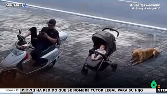 Por suerte, el perro se interpone en el camino logrando detenerlo con su cuerpo antes de que llegue al asfalto. Una instintiva y rápida acción que ha salvado la vida del pequeño.