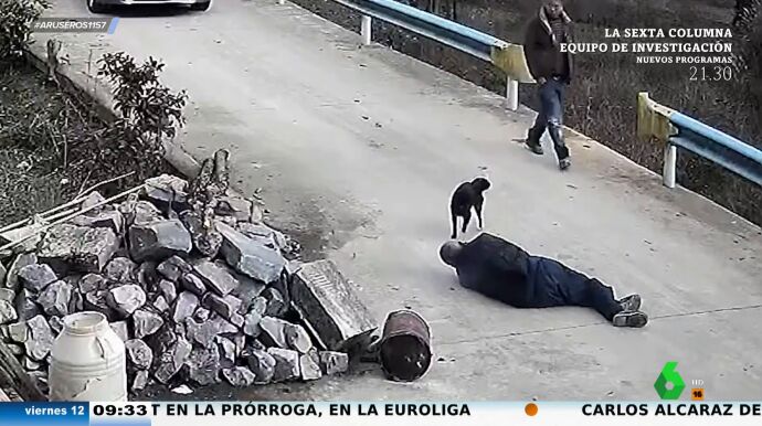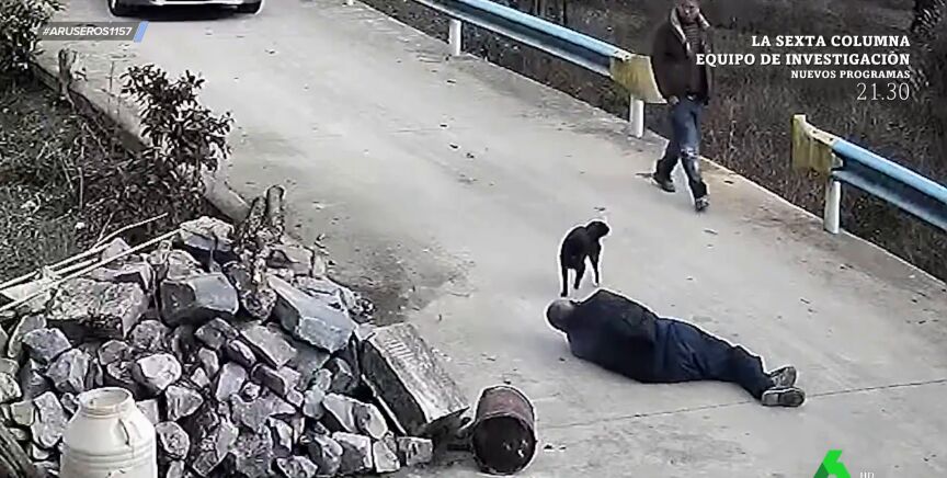 Las cámaras de seguridad captan la caída accidental de un hombre de 73 años en medio de una carretera. El hombre no consigue levantarse, pero su perro busca ayuda para que puedan socorrerle. Así se planta ante un coche para que se detenga.