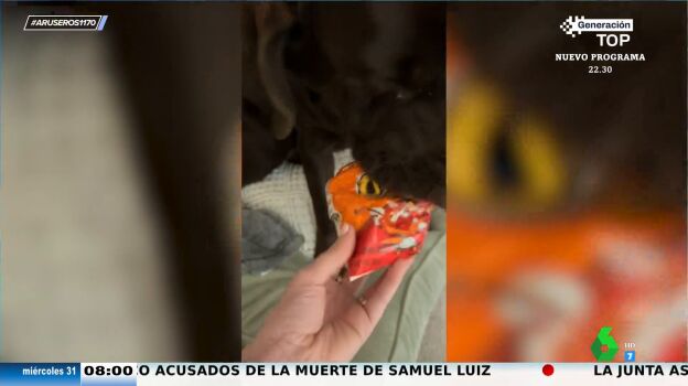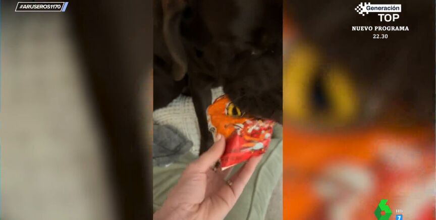 Hay que ser muy listo, pero también tener mala leche, para hacer lo que hace este perro. Como vemos en este vídeo viral emitido en Aruser@s, se esconde una bolsa de Cheetos en la boca. Por desgracia para él, su dueño lo pilla 'in fraganti'.