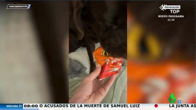 "¡Suéltalo, suéltalo!", le repite varias veces la chica en inglés hasta que el can finalmente se da por vencido y abre la boca. "¡Qué abusón! ¡Lo tenía todo!", exclama Angie Cárdenas en plató al ver el botín que mantenía oculto en sus fauces.