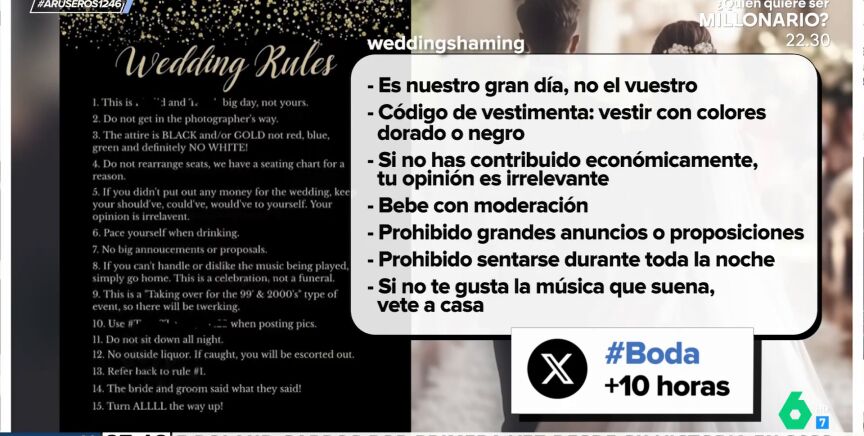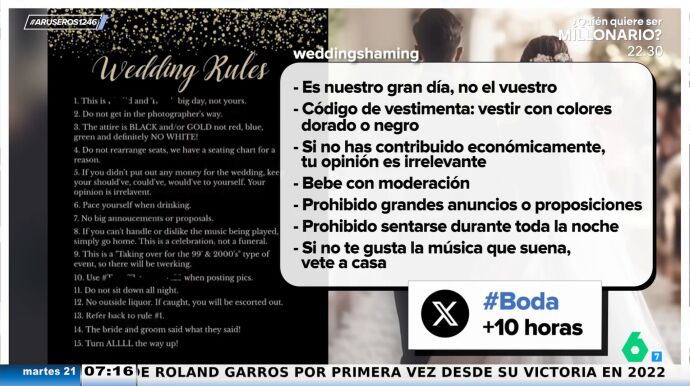 Una pareja ha dejado escrita una serie de reglas para las personas que asistan a su boda, originando una gran polémica viralporque algunos de los invitados afirman que son inasumibles. Por ejemplo, vestir con colores dorado o negro, beber con moderación y prohibido dar grandes anuncios o proposiciones.