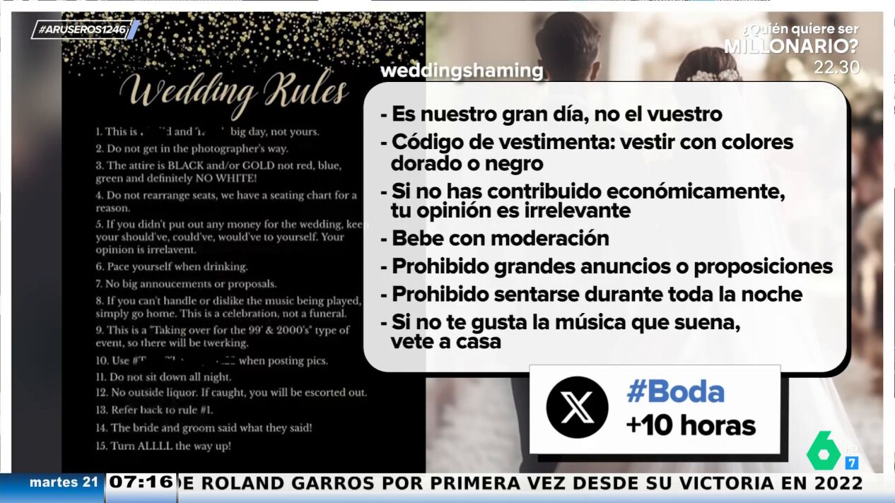 También prohíben sentarse durante toda la noche y mandan un tajante mensaje a los que no estén de acuerdo con la música del evento: "Si no te gusta la música que suena, vete a casa". Por último, también lanzan dos sorprendentes dardos a sus propios invitados: "Es nuestro gran día, no el vuestro" y "si no has contribuido económicamente, tu opinión es irrelevante".