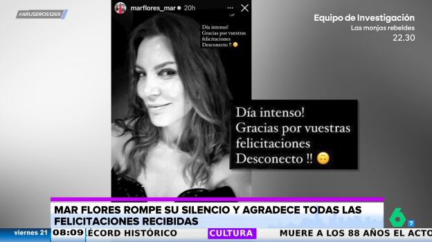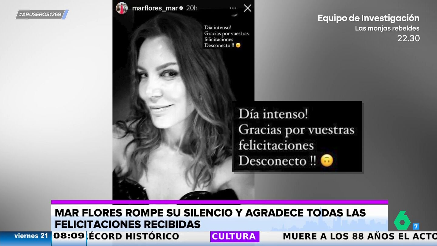 "Día intenso, gracias por vuestras felicitaciones, desconecto", destaca Mar Flores en su cuenta de Instagram para agradecer las muestras de cariño recibidas tras saberse que se convertirá en abuela por parte de su hijo Carlo Costanzia y Alejandra Rubio.