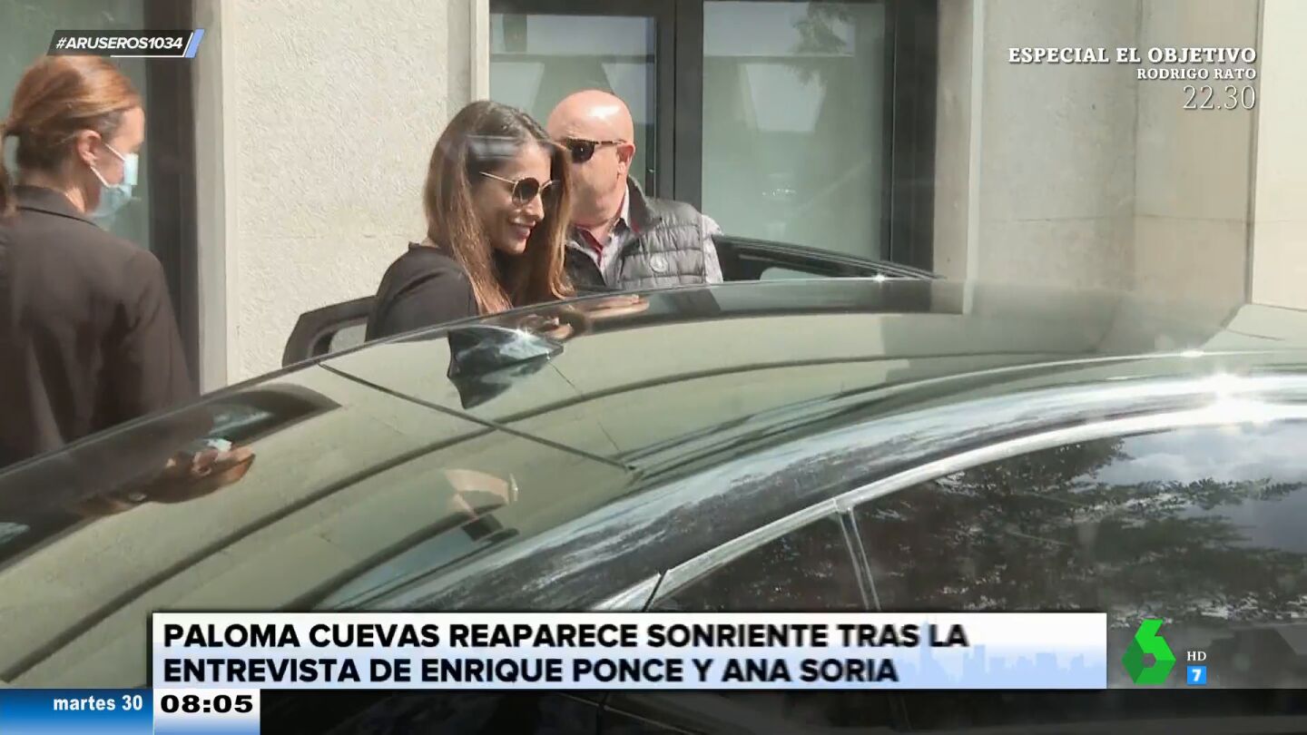 Paloma Cuevas ha reaparecido sonriente tras la entrevista de Enrique Ponce y Ana Soria en el plató de 'El Hormiguero'. Tatiana Arús enseña en el vídeo principal de esta noticia el momento en el que Paloma Cuevas es preguntada por los medios sobre dicha entrevista al salir de un centro de medicina estética.