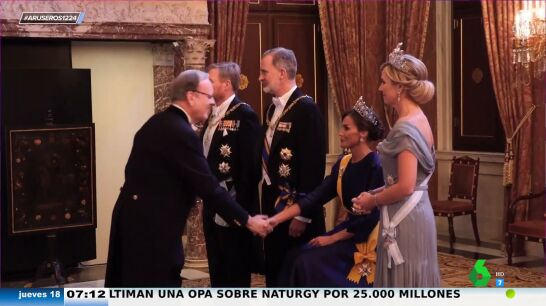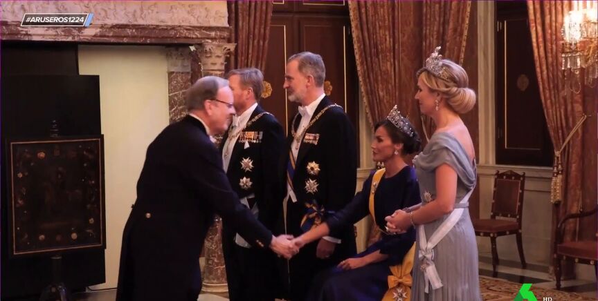 Además, Alfonso Arús cuenta que "los focos se detuvieron en la reina Letizia cuando tuvo que hacer el besamanos sentada por un problema físico". Y es que antes de la cena gala los reyes tuvieron que hacer 45 minutos de besamanos en donde la reina Letizia tuvo problemas con sus tacones de 12 centímetros. "Es cierto que desde hace tiempo ella sufre el neuroma de Morton, lo que le genera una gran dolencia en los pies", explica Tatiana Arús, que destaca que por eso le colocaron una silla para realizar el trabajo.