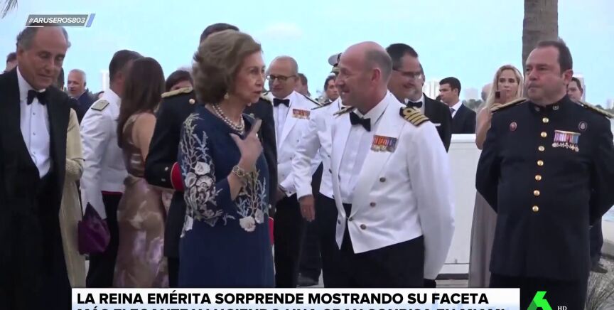 Como puede verse en el vídeo que acompaña a estas líneas, la reina acudió sola a un evento en el que se conmemoraba la primera vuelta al mundo del buque Juan Sebastián Elcano. Para al ocasión, Sofía de Grecia optó por un vestido largo de terciopelo azul marino y bordados de flores. También ha resultado llamativo que la monarca ha coincidido con Colate, expareja de Paulina Rubio.