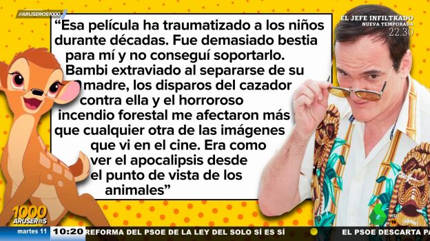 "No le falta razón y yo, de momento, no le voy a poner 'Bambi' a mi hijo", afirma David Broc en Aruser@s tras saber que el mismísimoQuentin Tarantino, uno de los directores de cine con la filmografía más sangrienta y violenta de Hollywood, quedó traumatizado con la película de Disney. "Fue demasiado bestia para mí y no conseguí soportarlo", ha afirmado el cineasta en el Teatro Coliseum de Barcelona, durante la presentación de su primer libro de no ficción.