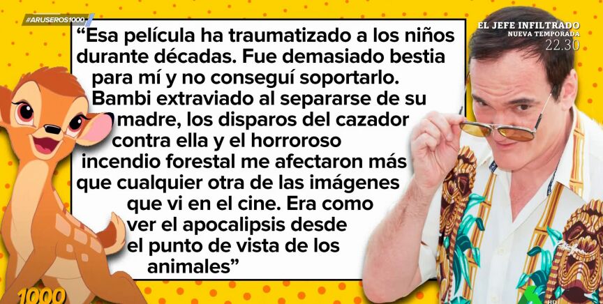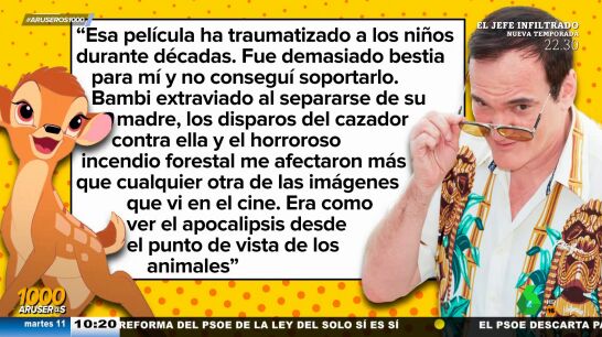 Tarantino ha rememorado algunos de los momentos más duros del filme de dibujos animados, desde el momento en el que el pobre ciervo se queda huérfano y los disparos del cazador hasta el incendio forestal. "Me afectaron más que cualquier otra de las imágenes que vi en el cine", ha reconocido.