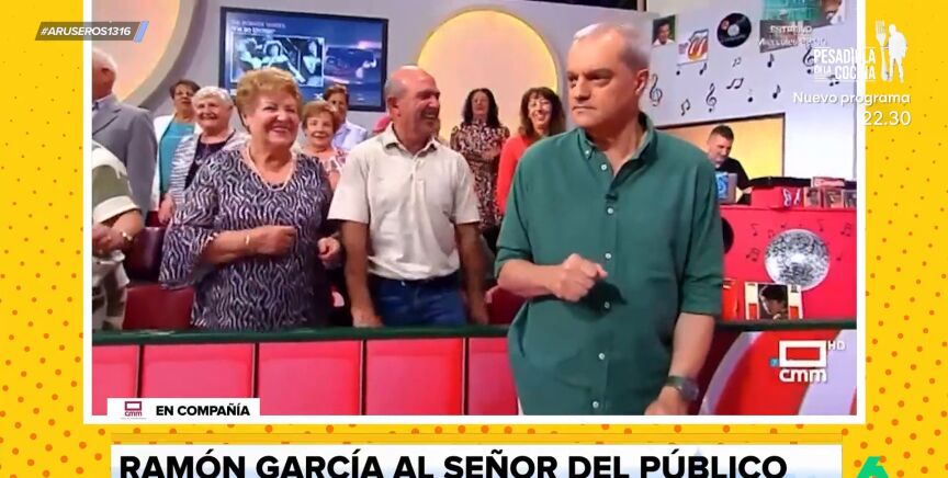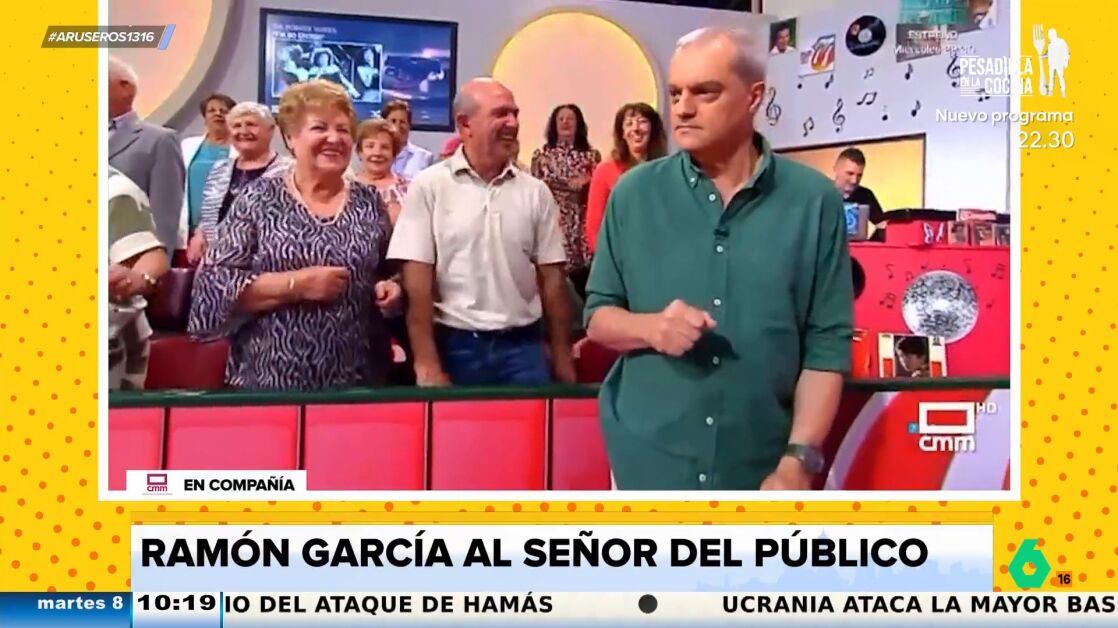 Alfonso Arús presenta el gracioso 'dardo' de Ramón García en pleno directo en su programa 'En compañía' a un señor que estaba en el público. El presentador del programa se acercaba al público a bailar la canción de 'The Pointer Sisters - I'm So Excited' cuando, de pronto, uno de los hombrs sorprendió al presentador con su "arrítmico" movimiento de caderas.