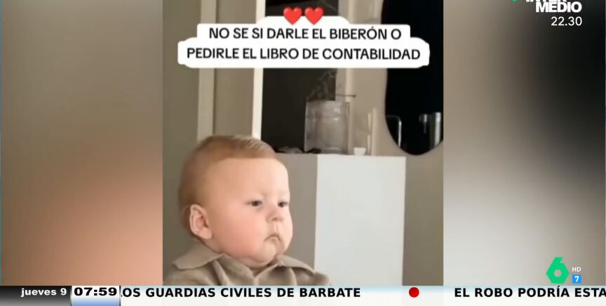 "No sé si darle el biberón o pedirle el libro de contabilidad", escribe el padre en este vídeo. El hombre graba a su hijo sentado en el ordenador super serio y concentrado. Las imágenes duran unos cuantos segundos y se puede ver como el pequeño no cambia de cara en ningún momento.