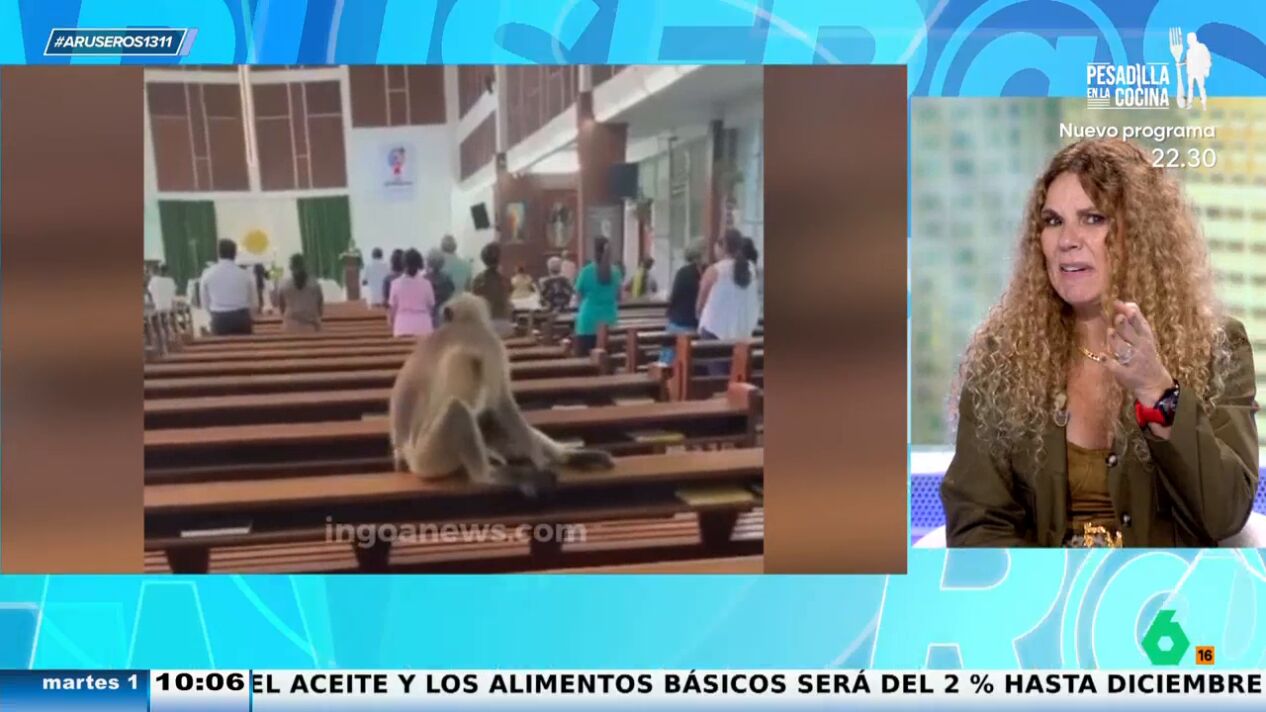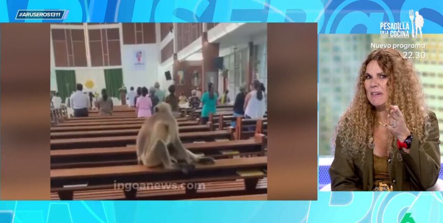 Después de ver un vídeo viral de un mono en misa, Angie Cárdenas y varios tertulianos tienen claro que el animal no está allí por ser creyente. Cárdenas y los colaboradores piensan que está ahí para robar algo.