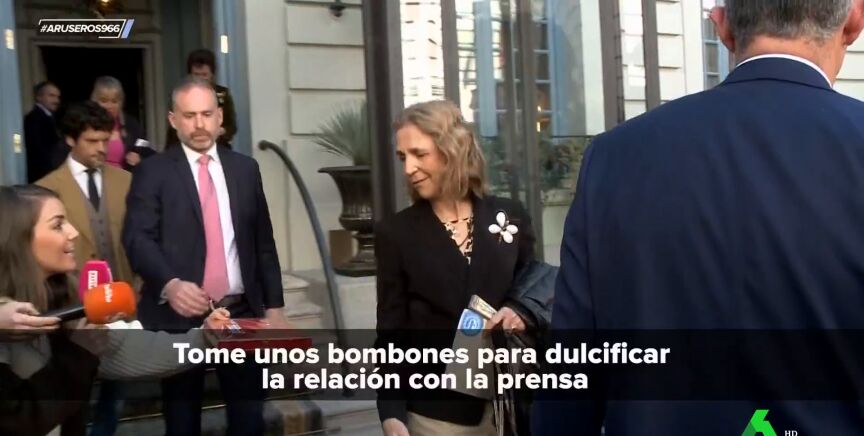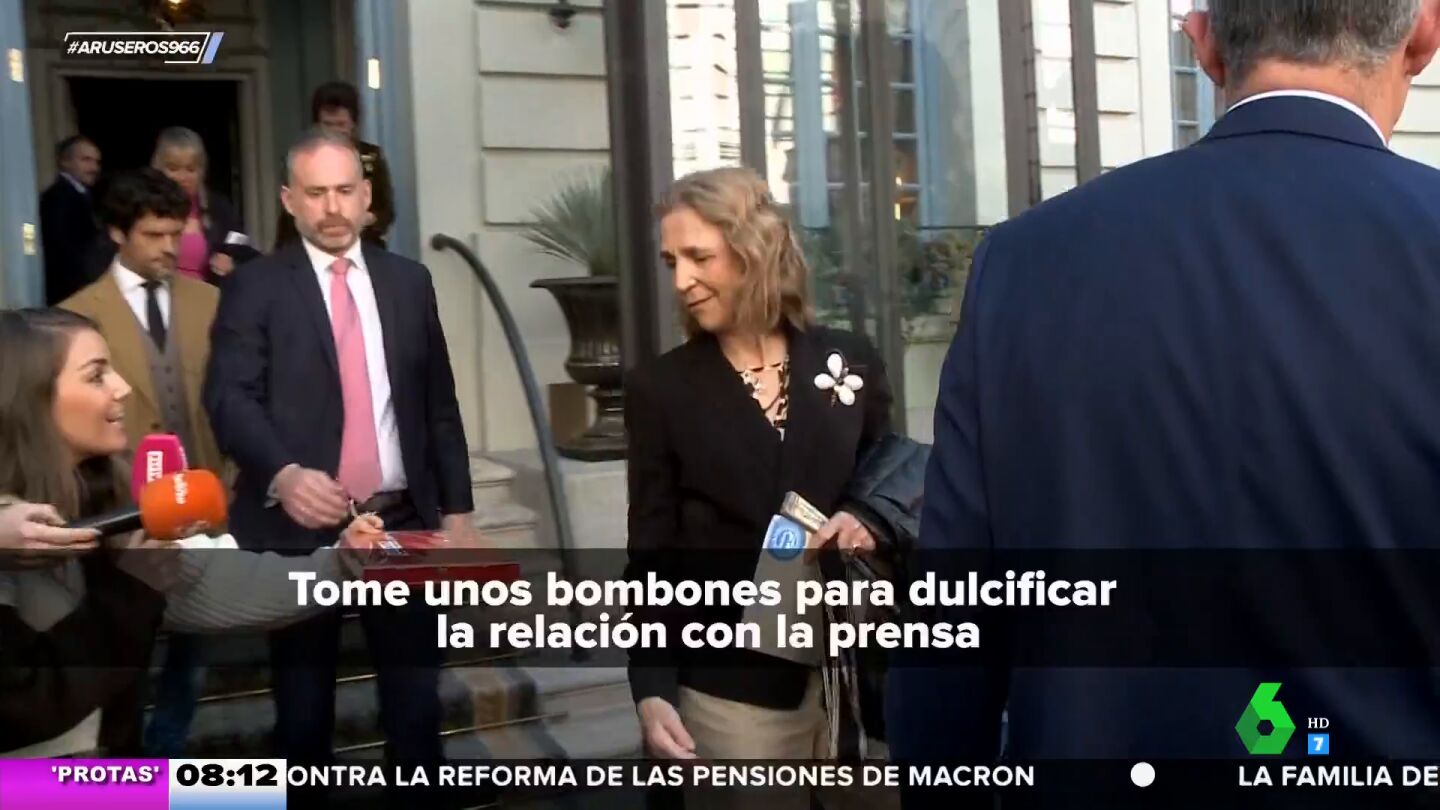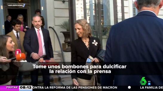 Una periodista ha regalado unos bombones a la infanta Elena para "dulcificar" su relación con la prensa. Doña Elena ha reaccionado con simpatía ante este divertido gesto y ha asegurado que se lleva "bien" con ellos con una sonrisa.