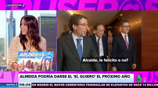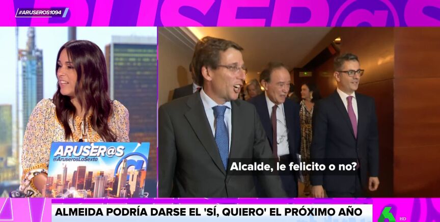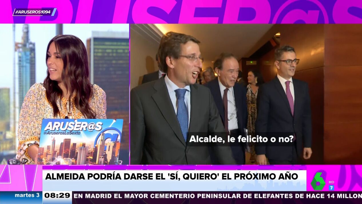 En este vídeo puedes ver la divertida reacción de Patricia Benítez cuando en el plató de Aruser@s hablan del rumor de que José Luis Martínez-Almeida se vaya a casar con su novia, Teresa Urquijo, en 2024.