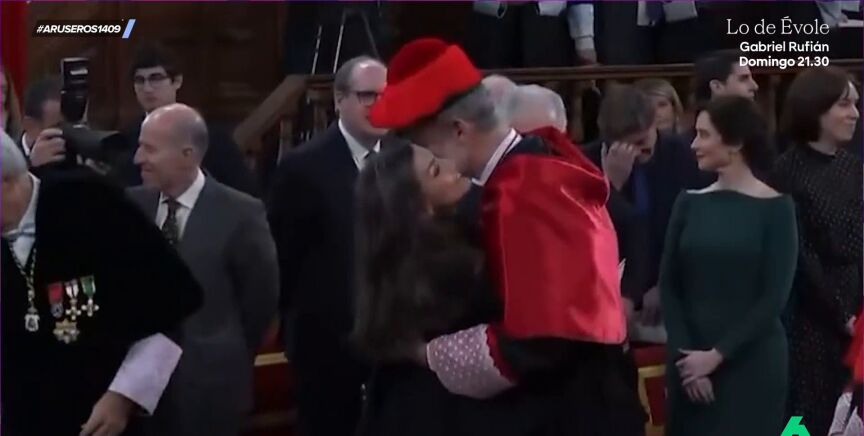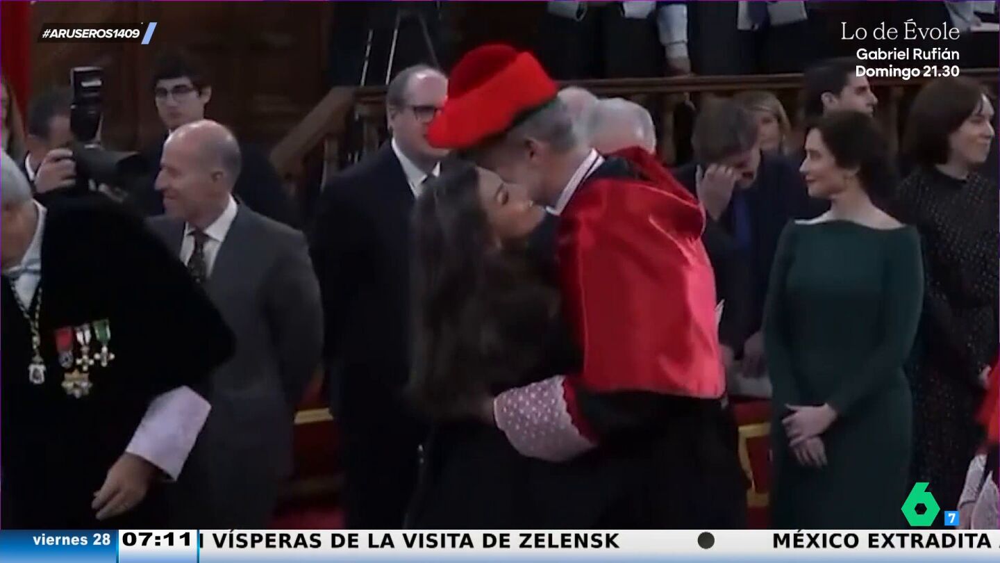 El rey Felipe VI ha sido investido doctor honoris causa por la Universidad de Alcalá, la primera universidad española que le otorga esta distinción. En el acto también ha acudido la reina Letizia, con la que se ha fundido en un abrazo, protagonizando un "romántico gesto que se ha hecho viral", según explica Tatiana Arús en el vídeo principal de esta noticia.