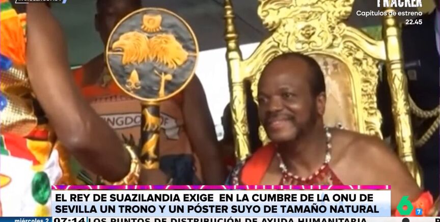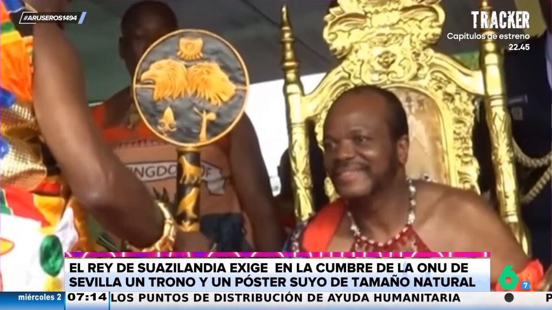 Un trono y un póster suyo a tamaño natural. Son las exigencias del rey de Suazilandia para participar en la cumbre de la ONU que se está celebrando durante estos días en Sevilla. Al evento ha venido "acompañado de su mujer número 9 de las 15 que tiene", informa Tatiana Arús en Aruser@s.