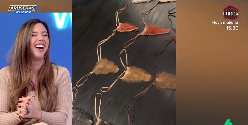 "Si os faltan ideas de qué regalar de cara a estas próximas navidades, aquí tenéis la nueva propuesta de la firma de ropa interior de Kim Kardashian", dice Tatiana Arús en el plató de Aruser@s Weekend intentado -sin éxito- aguantarse la risa.
