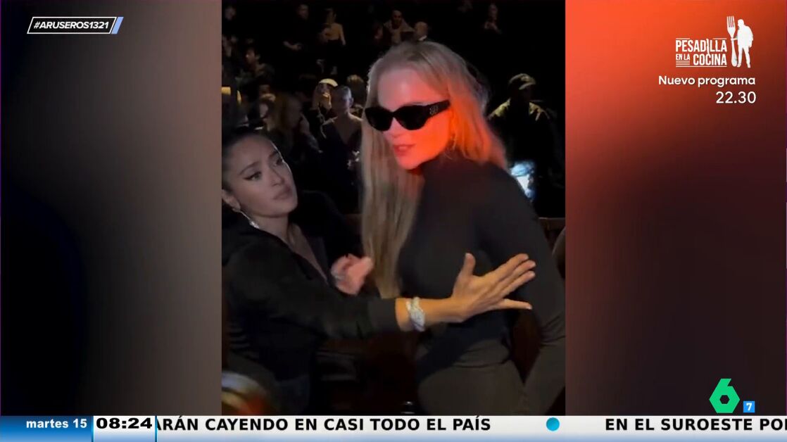 "Las imágenes nos desvelan que hay mal rollito en el momento en el que Salma Hayek intenta colocar a Nicole Kidman para la fotografía y ella le dice que no le toque", explica Tatiana Arús en el vídeo.