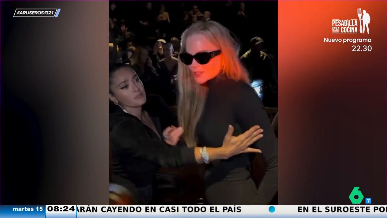 Tatiana Arús enseña el tenso momento que han protagonizado Salma Hayek y Nicole Kidman en el desfile de Balenciaga en la Semana de la Moda de París. "Las imágenes nos desvelan que hay mal rollito en el momento en el que Salma Hayek intenta colocar a Nicole Kidman para la fotografía y ella le dice que no le toque", explica la colaboradora de Aruser@s, que detalla que "el problema es que Nicole Kidman no vocaliza en exceso".