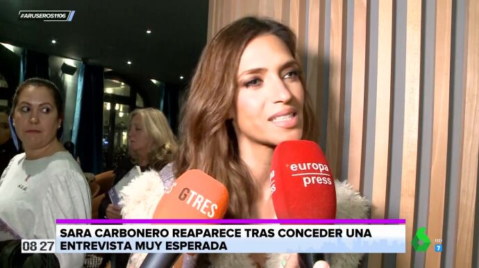 "Estoy muy bien, muchas gracias", afirma Sara Carbonero, que destaca que está "un poco más tranquila", pero "con proyectos y ganas de hacer cosas". Por todo ello, la periodista resalta que está pasando por "un muy buen momento de tranquilidad y serenidad".