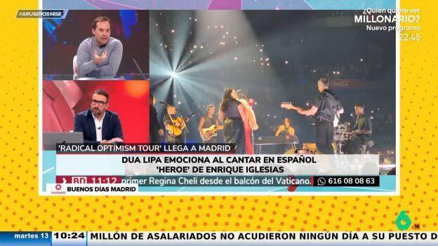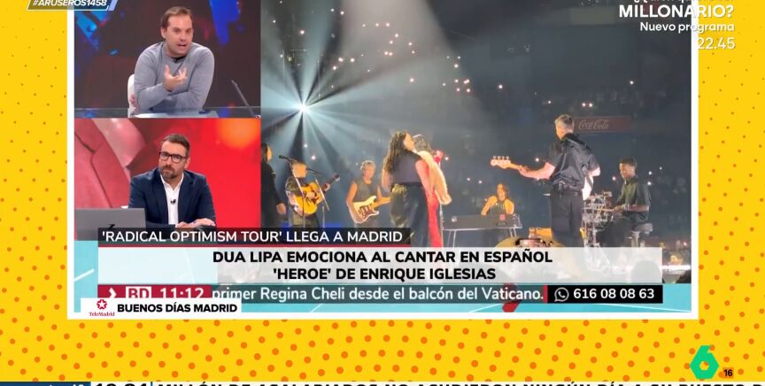En el programa 'Buenos días, Madrid' charlaban sobre el último concierto de Dua Lipa, donde la cantante conquistó el Movistar Arena, en Madrid, interpretando 'Héroe', la canción de Enrique Iglesias. "Ojalá él cantara como lo hizo Dua Lipa; ella quiso tener ese gesto y eligió una canción suya cuando él celebraba los 50 años", informaba el periodista Saúl Ortiz, que opinaba así de tajante: "Cumple 50 años y 29 cantando mal".