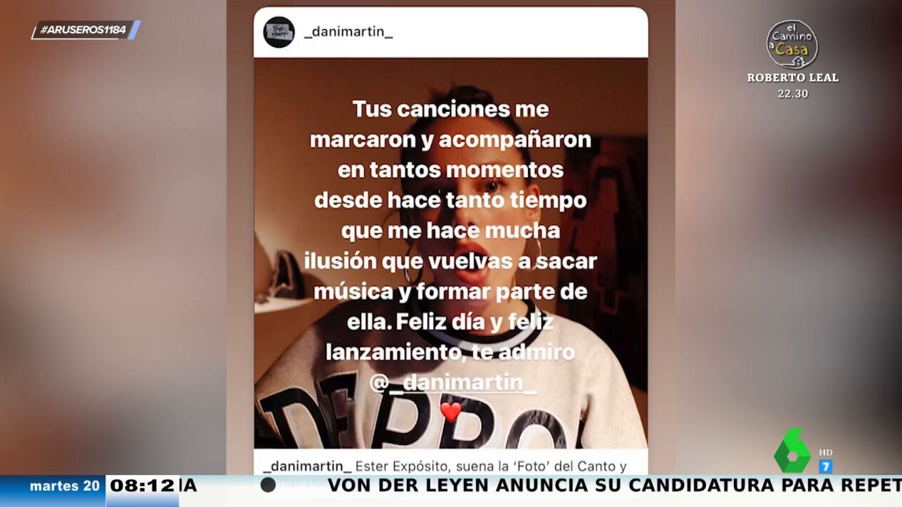 Dani Martín ha dedicado una canción a Ester Expósito asegurando estar loco por ella y la actriz ha respondido con un mensaje un tanto seco que analizan en Aruser@s. "Venga, hasta luego", afirman sorprendidos.
