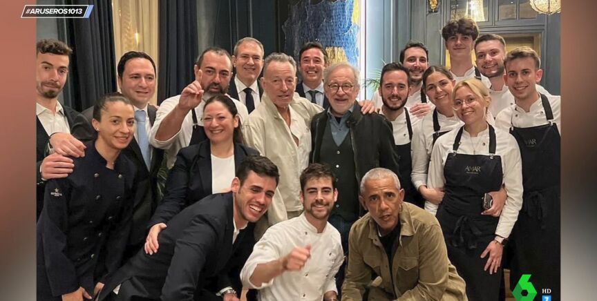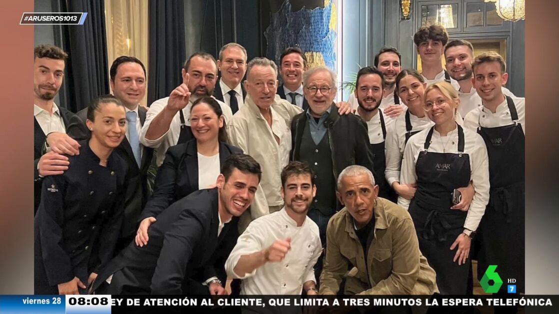 El expresidente norteamericano Barack Obama, el director de cine Steven Spielberg y el cantante Bruce Springsteenhan cenado juntos de madrugada en un restaurante de Barcelona. Junto a sus parejas han acudido al restaurante del hotel El Palace de Barcelona, especializado en productos del mar y que regenta el chef sevillano Rafa Zafra. Obama, Spielberg y Springsteen se han fotografiado con los chefs y personal del local como se puede ver en el vídeo principal de esta noticia.