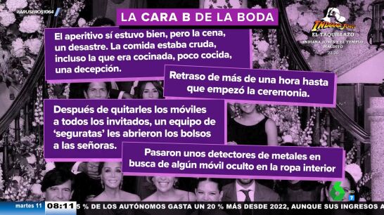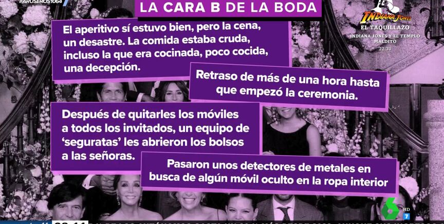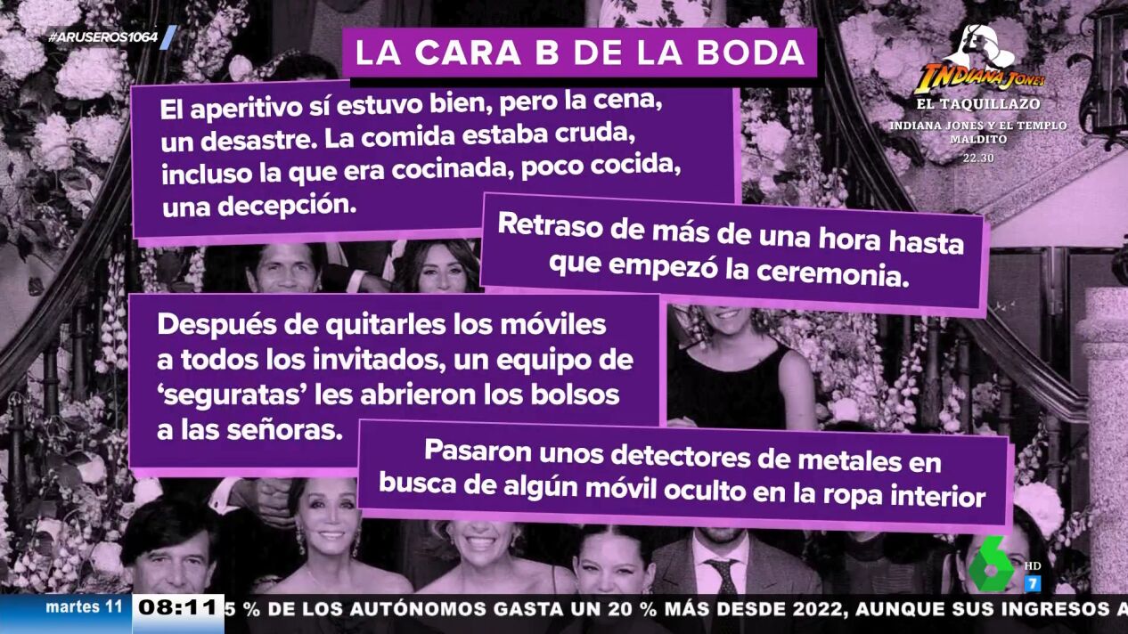 Además, Alfonso Arús cuenta más detalles de la cara B de la boda: "Lo que ha molestado a los invitados es que el aperitivo estuvo bien, pero la cena fue un desastre según algún invitado". "Para gustos, colores", destaca Tatiana Arús, que detalla que "hay personas que dicen que les encantó, pero algunos cuentan que fue excesivo el tema del crudo y que los platos calientes llegaron fríos". Además, la colaboradora explica que además del retraso de 45 minutos de lo novios, el registro de seguridad retrasó más la boda.