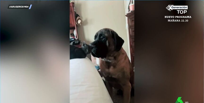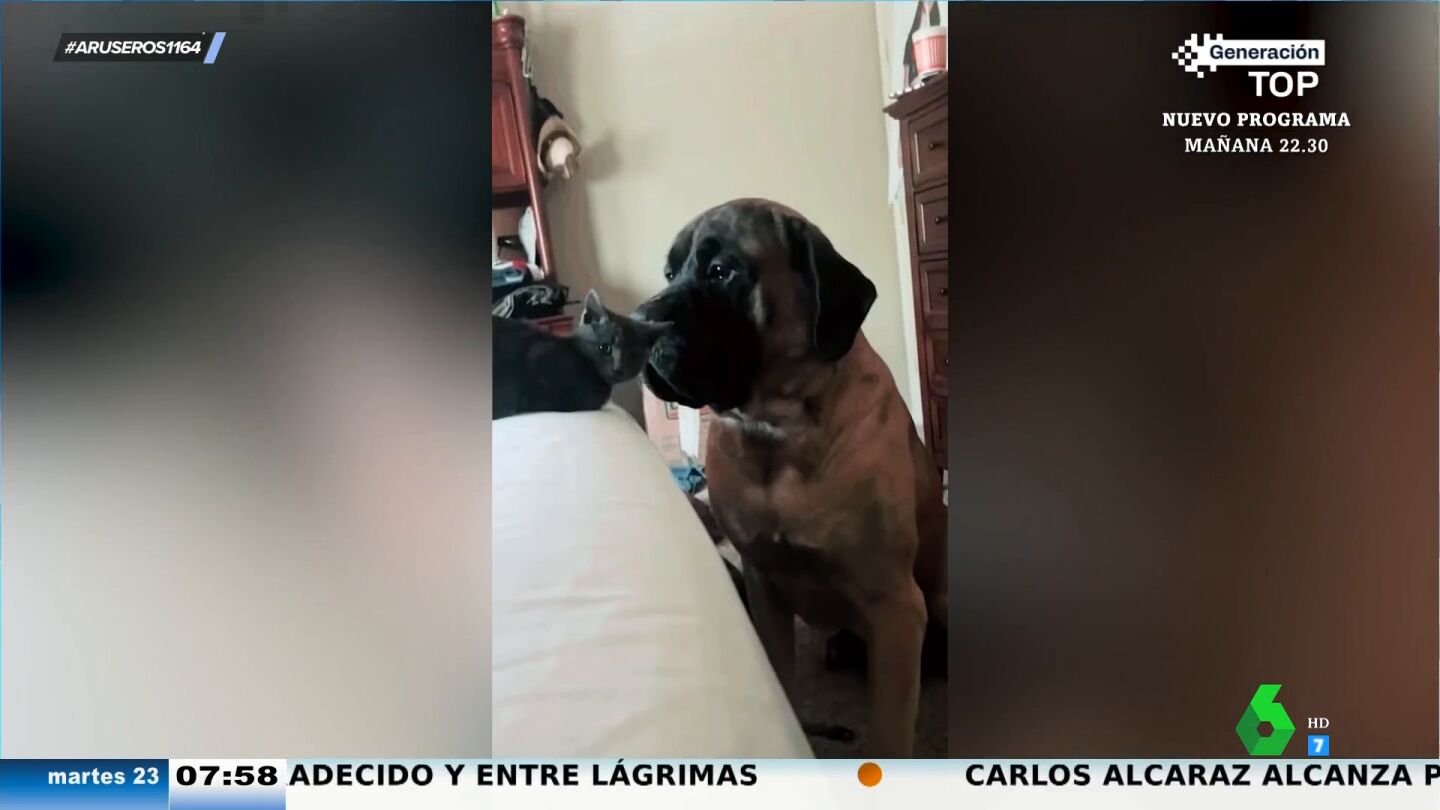 Con curiosidad, cuidado y mucha paciencia, este mastín inglés de 90 kilos se acerca hasta su nuevo hermanito, el que sus padres humanos le acaban de presentar: un gatito recién nacido. Poco a poco, como podemos ver en este vídeo viral emitido en Aruser@s, lo estudia con esmero, lo huele y observa, sin hacer ni un solo movimiento brusco.