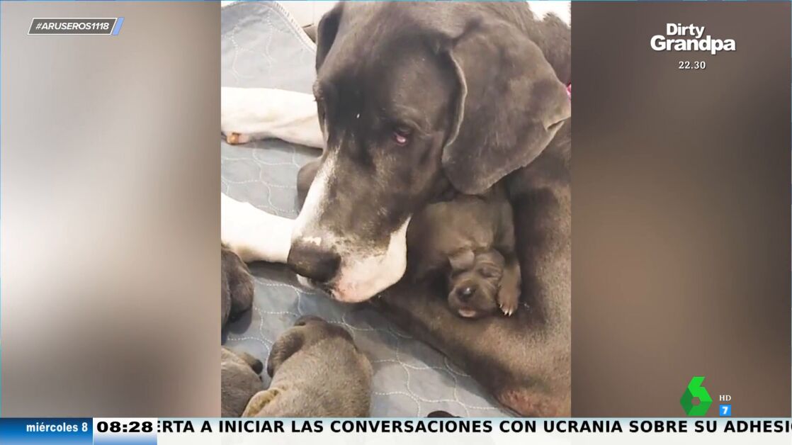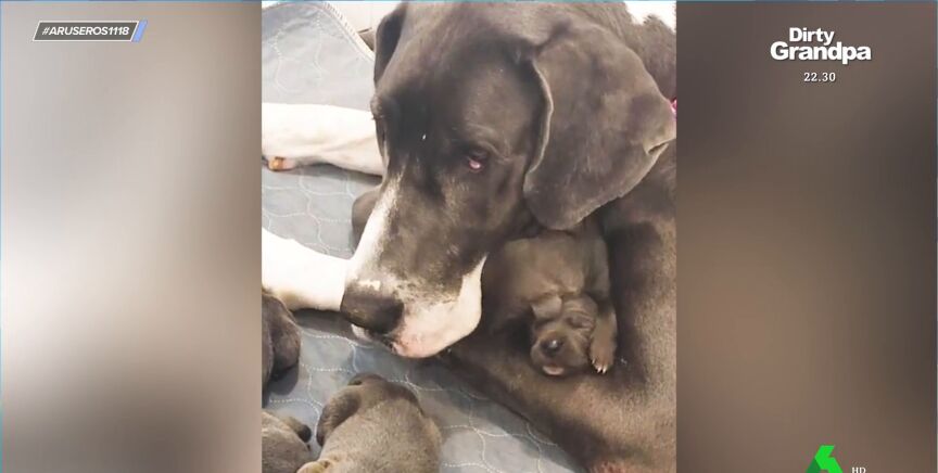 Alfonso Arús enseña en el plató de Aruser@s este vídeo que "está dando la vuelta al mundo". Su protagonista es una perra Gran Danés que ha dado a luz a 15 cachorros. La perra llegó a un centro de acogida de animales en la recta final de su embarazo, lo que nos esperaban sus cuidadores que es tendría hasta 15 cachorros.