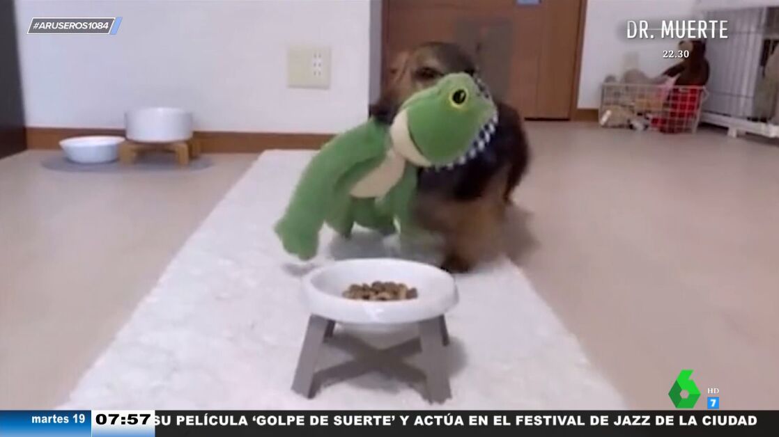 Aunque estas frases parezcan el inicio de un cuento o un chiste infantil, lo cierto es que esto ha ocurrido en la vida real, aunque todos los animalitos sean de peluche. Bueno, todos, menos el perro. En este vídeo viral emitido en Aruser@s somos testigos de cómo este can lleva uno por uno a todos sus juguetes al comedero donde tiene su pienso.