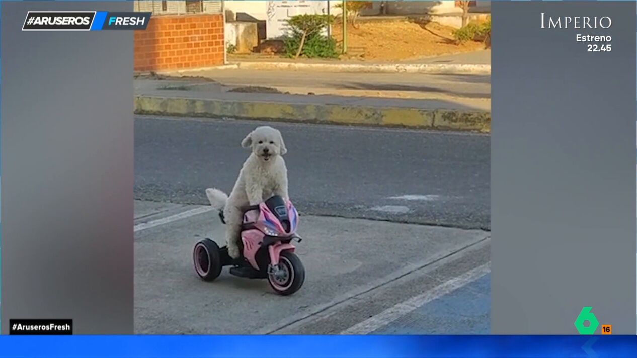 Los vecinos de esta calle no pueden creer lo que están viendo, ¡un perro montando una moto de juguete como si fuera un verdadero motero!. En este vídeo de Aruser@s puedes ver el viral.
