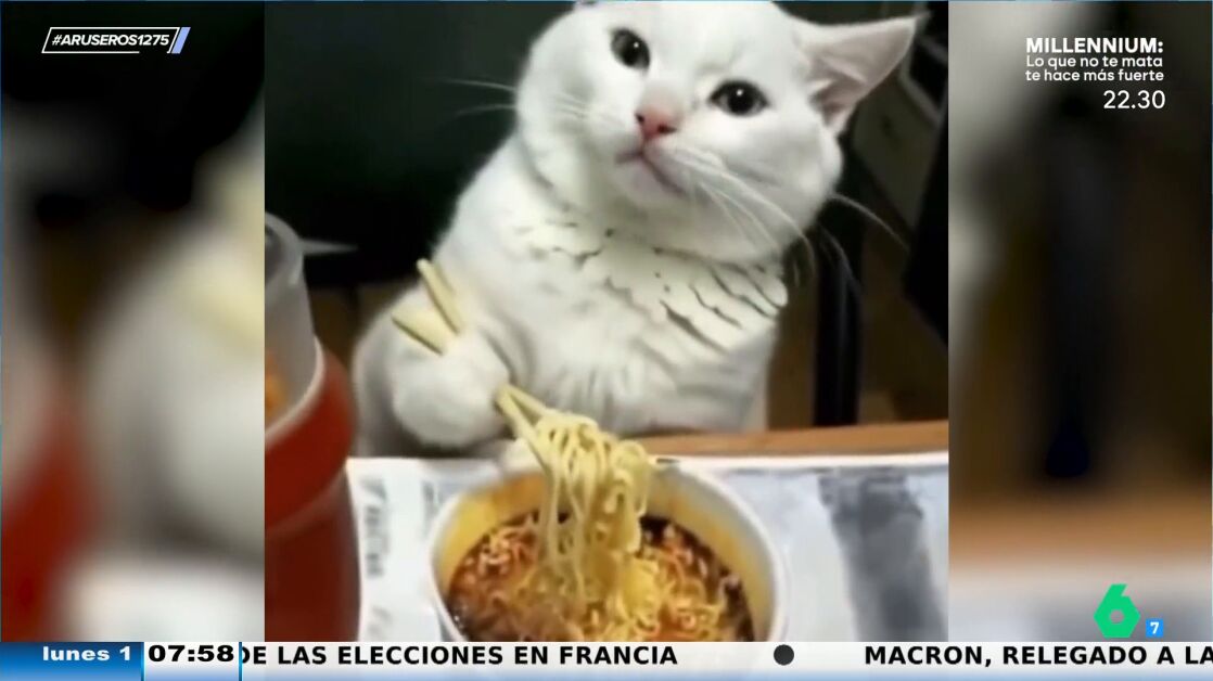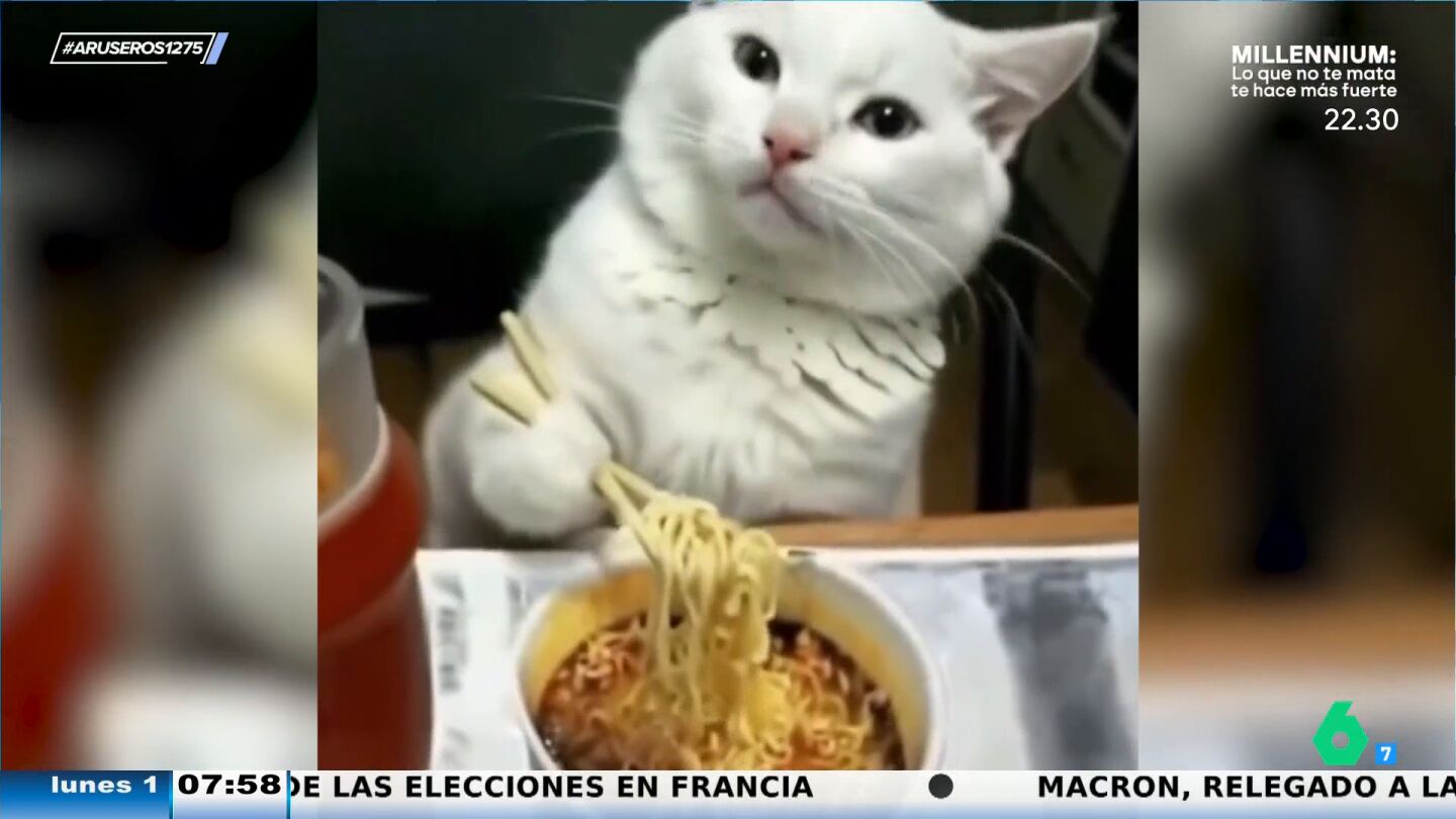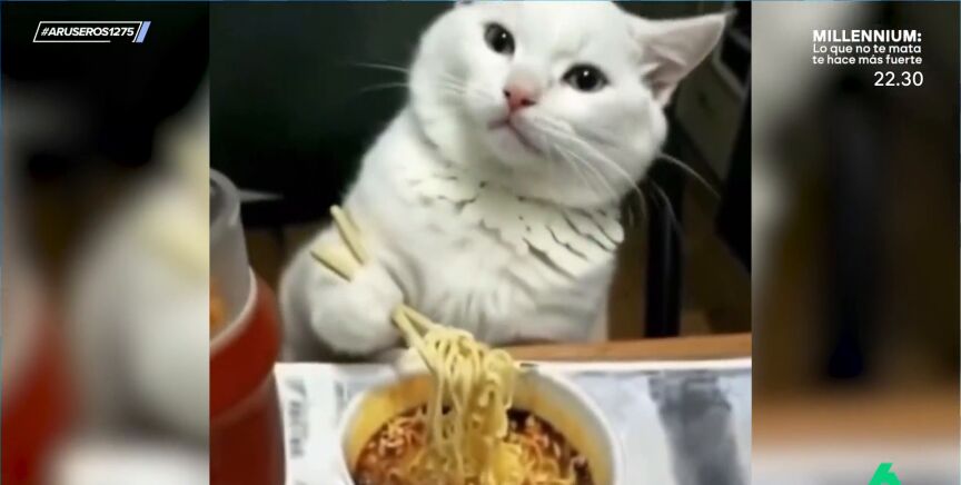 "Ya es triste que yo necesite hacer la trampa y, en cambio, el gato coma perfectamente", afirma Alfonso Arús, que trae al plató de Aruser@s el vídeo viral de un gato que come sin ningún tipo de problema unos fideos con palillos chinos. En este vídeo puedes ver cómo el dueño graba el preciso momento en el que su mascota está comiendo del cuenco y agarra con sus patitas delanteras los palillos chinos y comienza a comer los fideos con total soltura.
