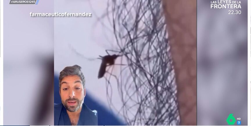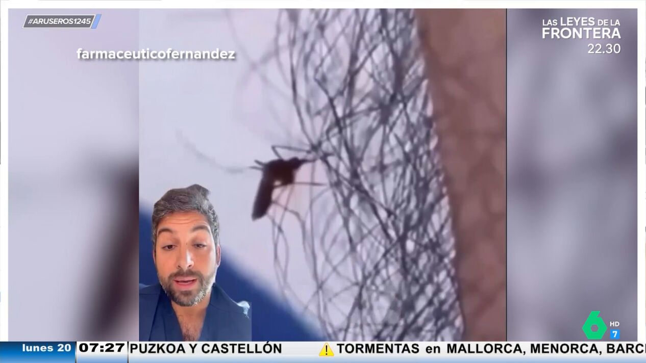 Alfonso Arús enseña en el plató de Aruser@s un vídeo de un farmacéutico que explica lo que puede ayudar el vello en el cuerpo humano para evitar que te piquen los mosquitos. "Seguro de que habéis oído eso de que el pelo protege, pero ¿de qué protege?", reflexiona el usuario '@farmaceuticofernandez', que enseña un vídeo de cómo el mosquito intenta picar a una persona, pero se encuentra una maraña de pelo "que no consigue atravesar".