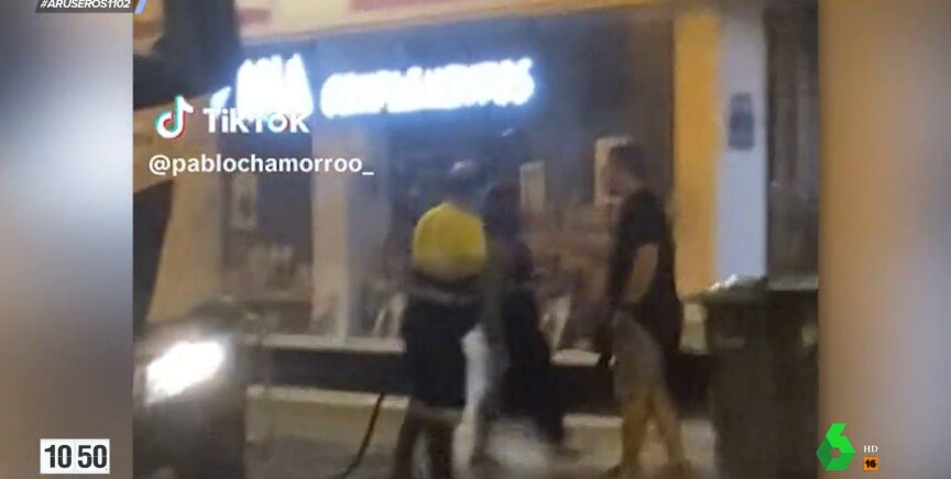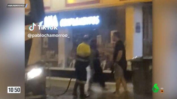 "Coge la manguera, moja por completo a la mujer y ella, enfadada, le lanza una lata de cerveza", explica Alfonso Arús, en el plató de Aruser@s. El presentador comenta también que este vídeo ha salido en todas partes. "El trabajador se la ha jugado mucho porque estaba el marido al lado. Imagínate lo que podría haber pasado", apunta Angie Cárdenas. Por otro lado, los tertulianos recuerdan que este señor estaba trabajando de madrugada y no tiene por qué "aguantar" a la pareja.