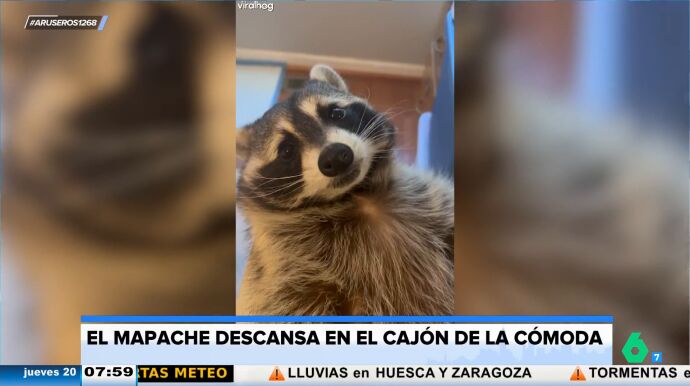 Alfonso Arús traía al plató un vídeo para su gusto "sensacional". En él se puede ver a un mapache que hace del cajón de una cómoda su cama. El animal está muy comodón, tumbado panza arriba.