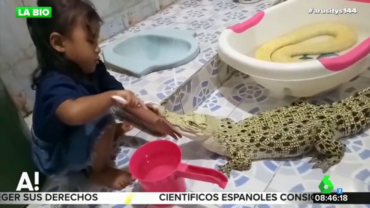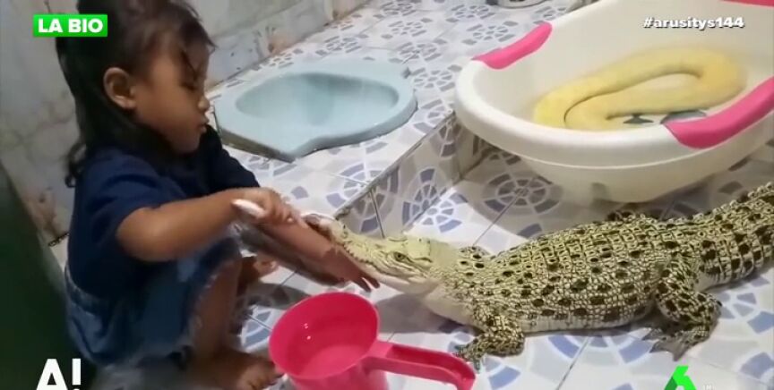 Arusitys analiza un polémico vídeo que se ha hecho viral en el que de ve cómo una niña cepilla los dientes y maquilla a un cocodrilo en el baño de su casa. La pequeña, además, está sentada junto a una pitón.