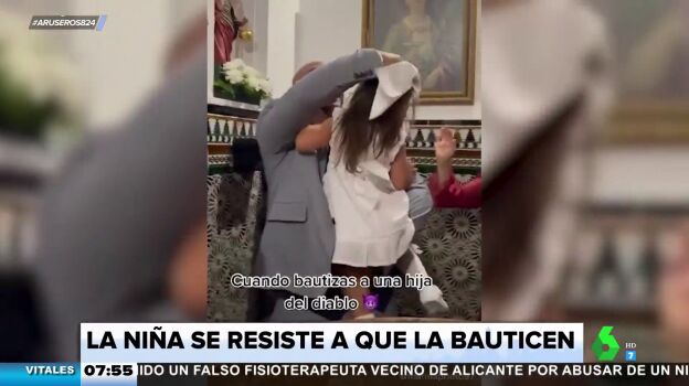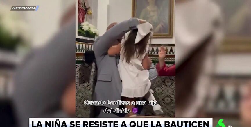 Así le sucedió a la protagonista de este vídeo viral mostrado en Aruser@s. Un familiar grabó el momento del bautizo de esta niña y acompañó las imágenes con un texto: "Cuando bautizas a una hija del diablo". Y es que no es para menos, ya que la pequeña no para de chillar y llega, incluso, a propinar patadas a la persona que la sostiene en brazos.
