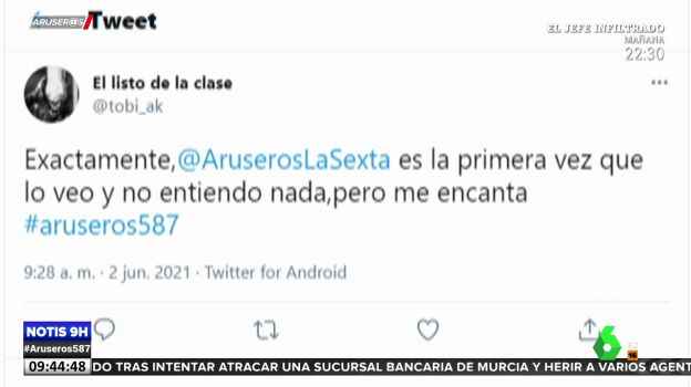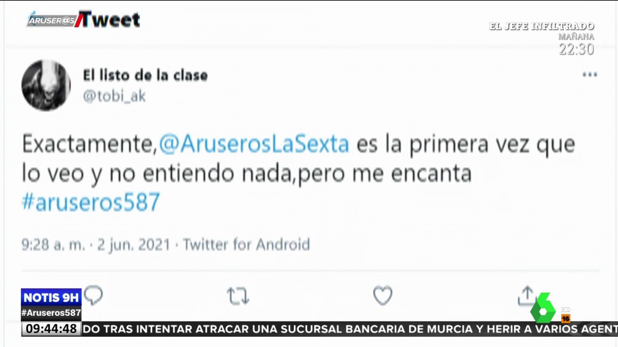 "Es la primera vez que veo Aruser@s y no entiendo nada, pero me encanta", ha escrito en su cuenta de Twitter.
