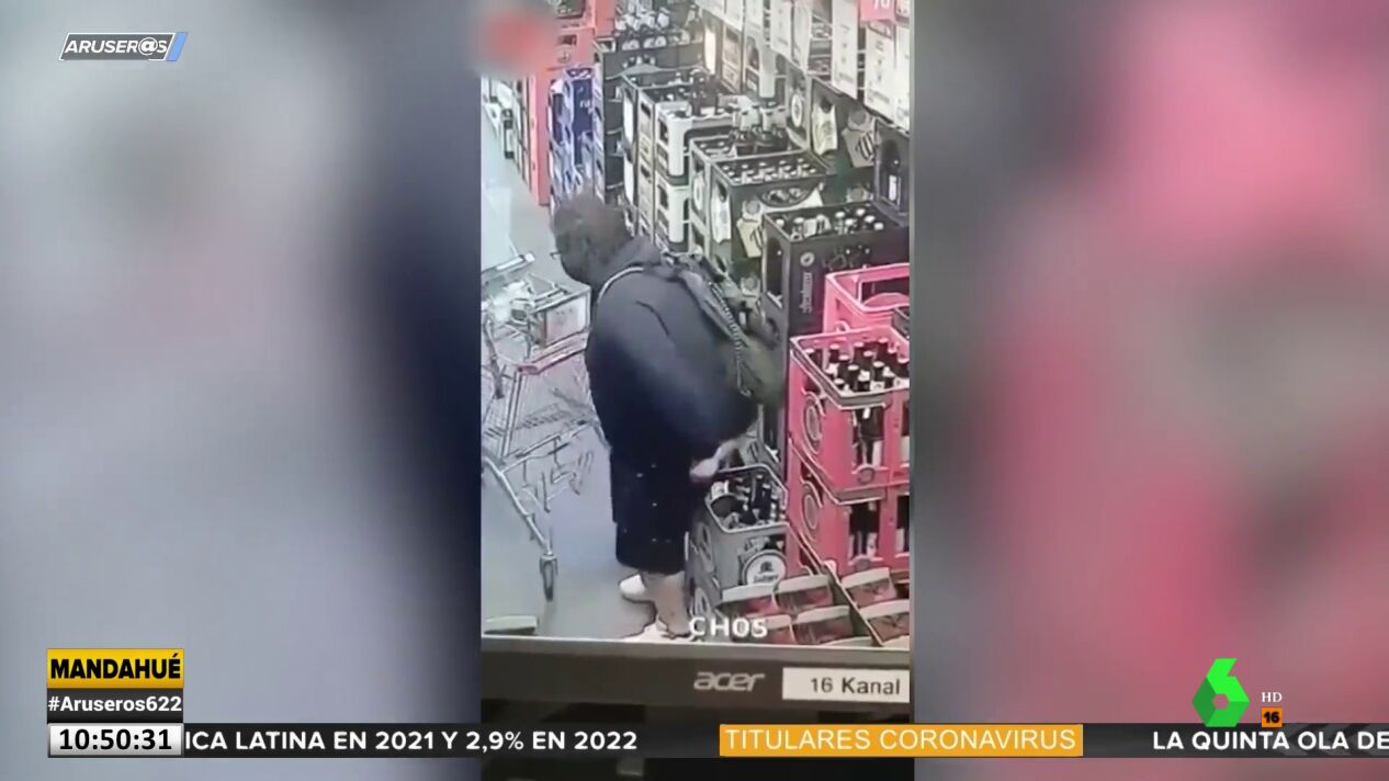 Un hombre hace sus necesidades sobre unas botellas de cerveza en un supermercado