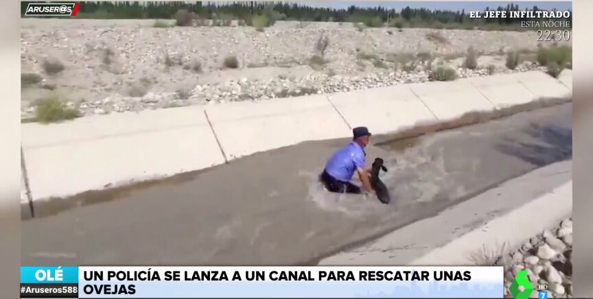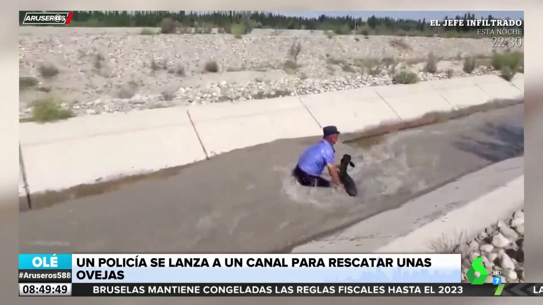 Un policía salva a varias ovejas y un perro de morir ahogados en un río