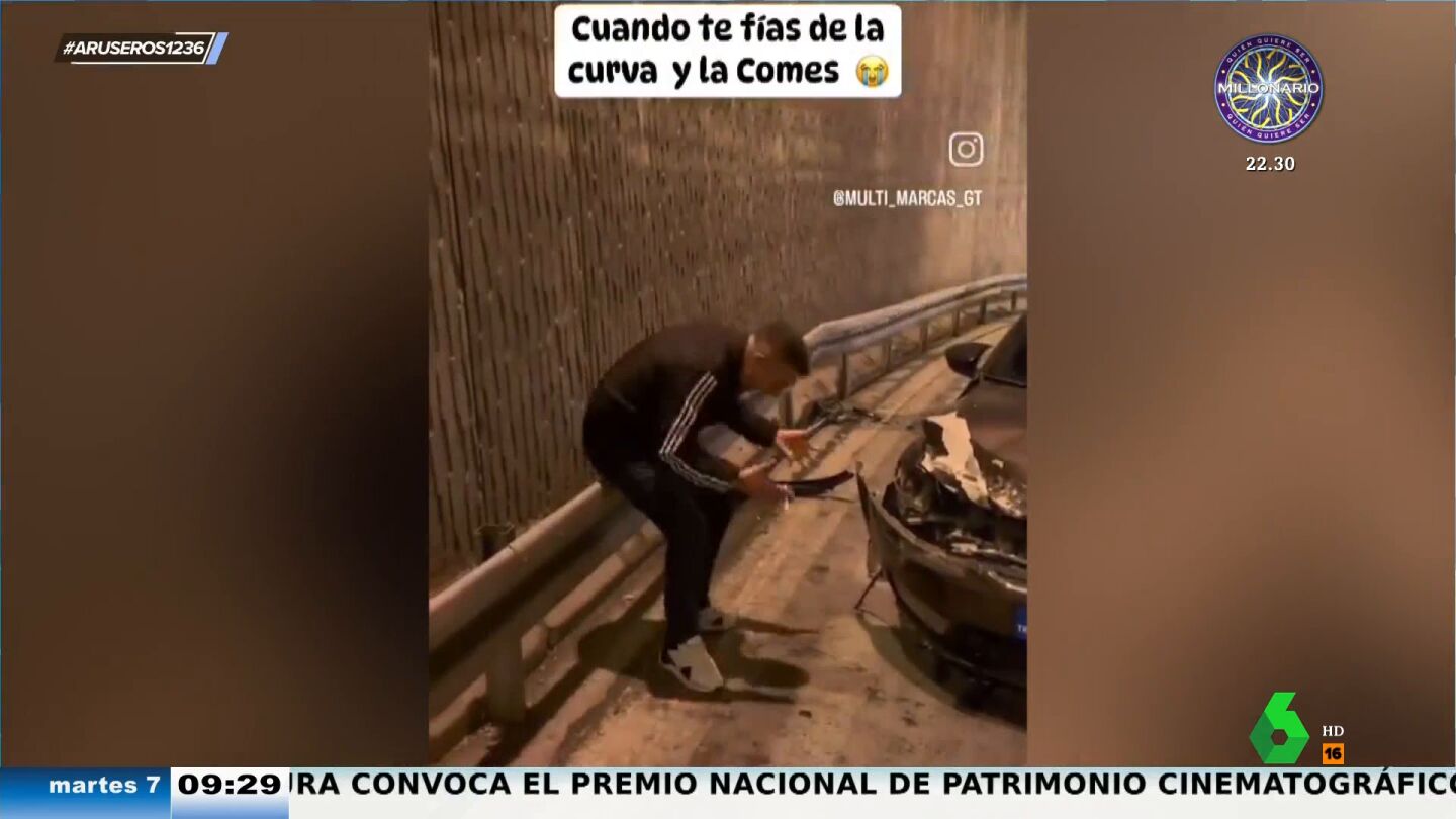 El joven se ha confiado con el coche en una curva y ha chocado su coche rompiendo la parte delantera. El hombre se encuentra bien, no ha sufrido daños, pero su reacción es la clara imagen del dolor.