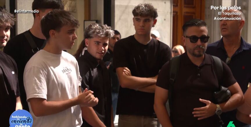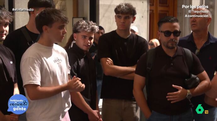 "¡Que no rompan con las costumbres de los españoles!", reclama un hombre, al que una chica le responde tajante: "El problema es que, desgraciadamente, la población española se preocupa más de un partido de fútbol que por los problemas que están sucediendo".