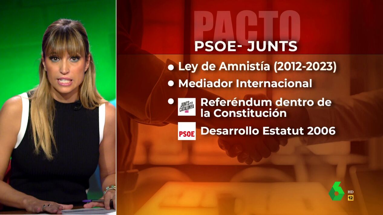En el vídeo sobre estas líneas, Sandra Sabatés analiza los principales puntos de este pacto, desde la ley de amnistía que beneficiaría a todos los implicados en el 'procès' desde 2012 hasta 2023. También la creación de un mediador internacional que supervise las negociaciones entre ambas partes.